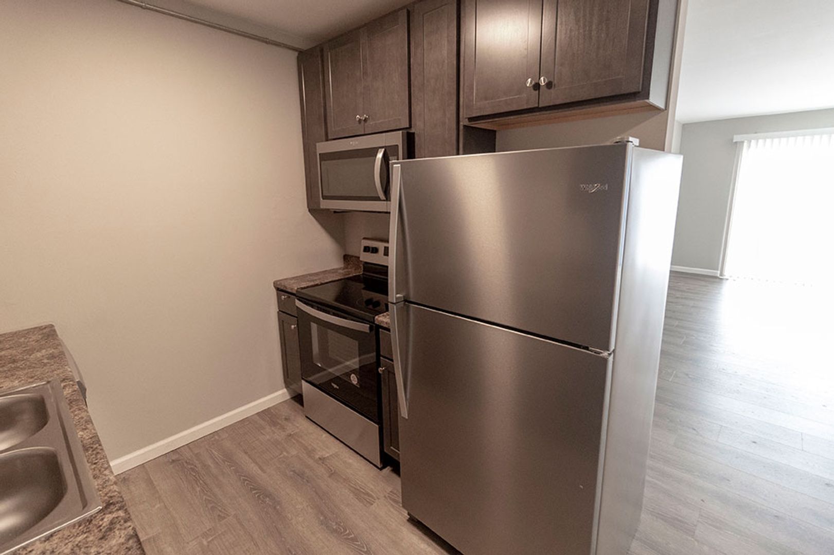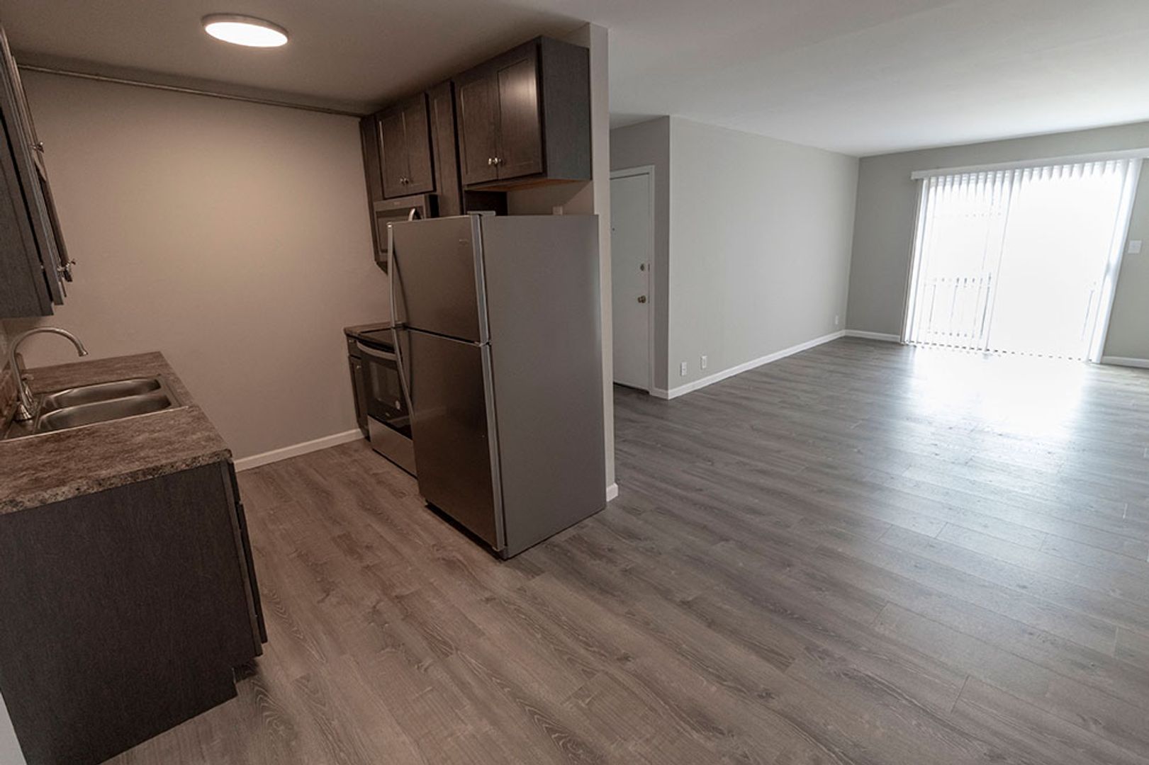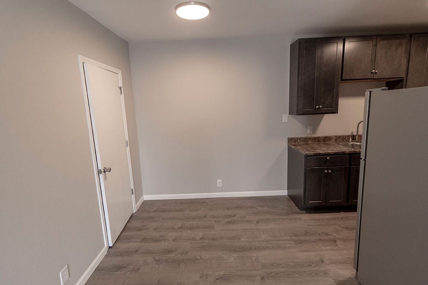 Fully remodeled one-bedroom apartment featuring vinyl plank flooring, new cabinets, and sleek stainless steel appliances. The home includes a separate storage area perfect for a pantry, plus a spacious bedroom equipped with a ceiling fan. The living room offers plenty of space for relaxing or entertaining, and on site parking is available. On-site washer and dryer provide added convenience, and the central location is within walking distance to multiple shopping centers.