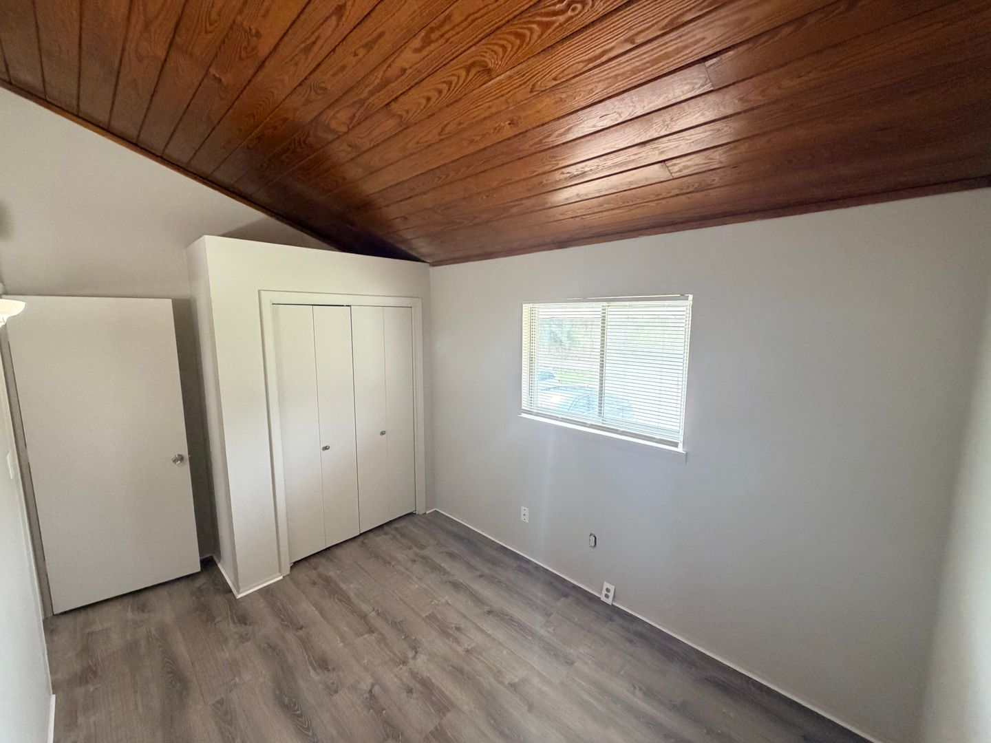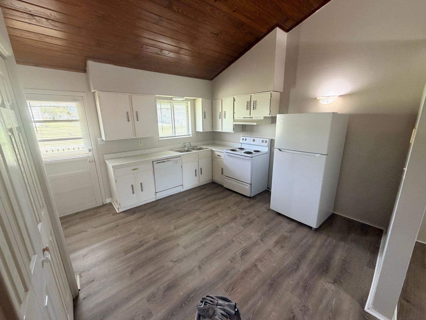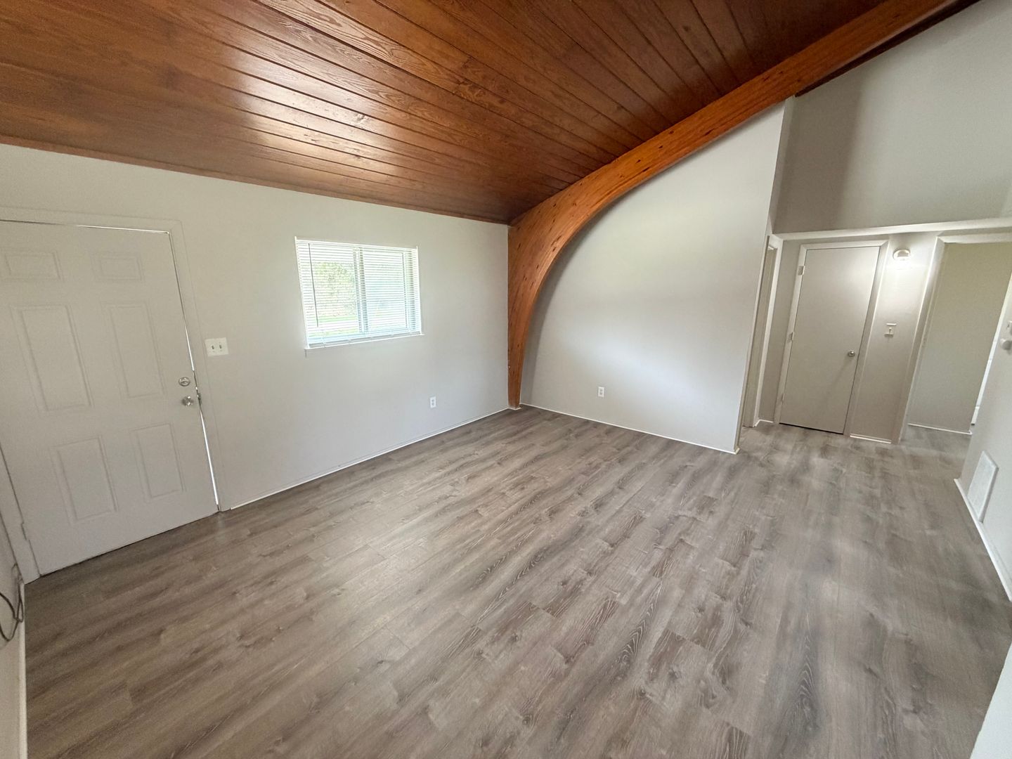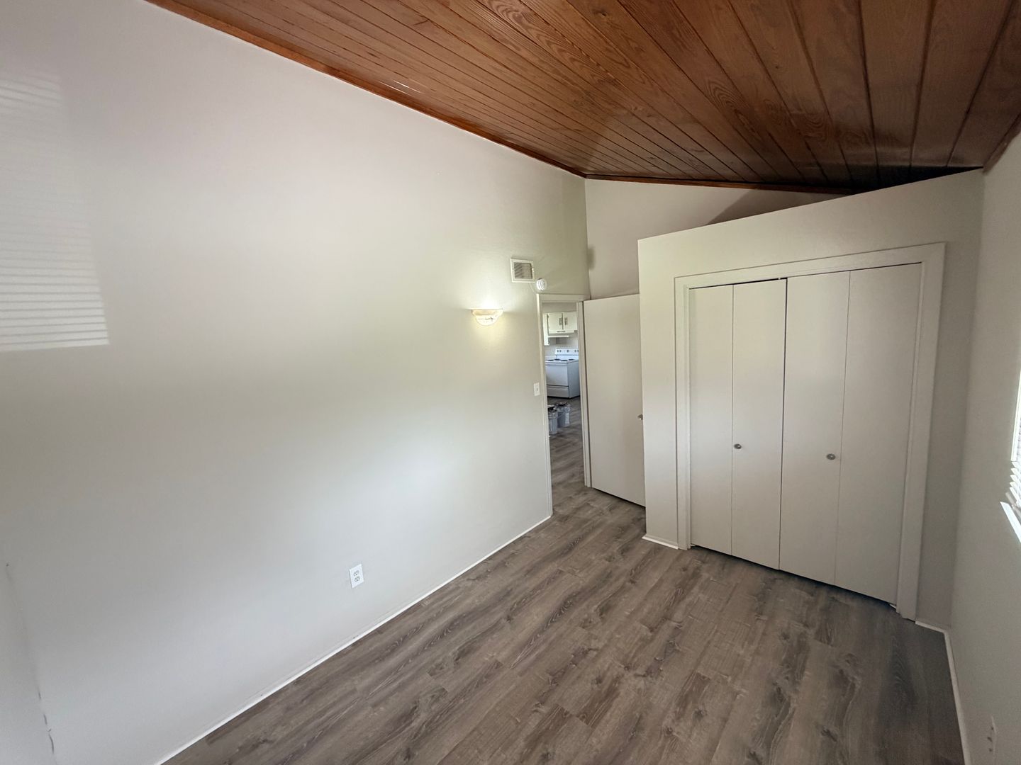 Inside, you’ll find a spacious living area highlighted by beautiful vaulted wood ceilings that add warmth and character to the space. Durable wood like flooring flows throughout the apartment, providing a modern look with easy maintenance. The kitchen offers generous counter space, perfect for cooking and entertaining.