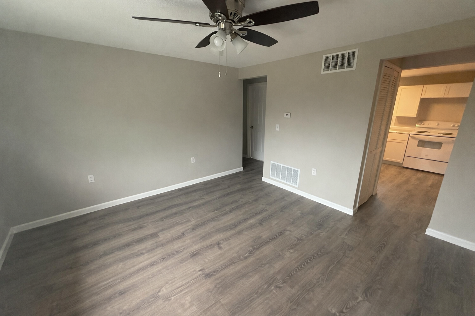Upper-level 2-bedroom unit featuring a spacious living room and eat-in kitchen. Both bedrooms share a convenient walk-through closet. The unit includes a full bathroom and additional hallway storage. Fully remodeled with luxury vinyl plank flooring, brand-new cabinets, and plenty of storage space, plus a stove and refrigerator included.