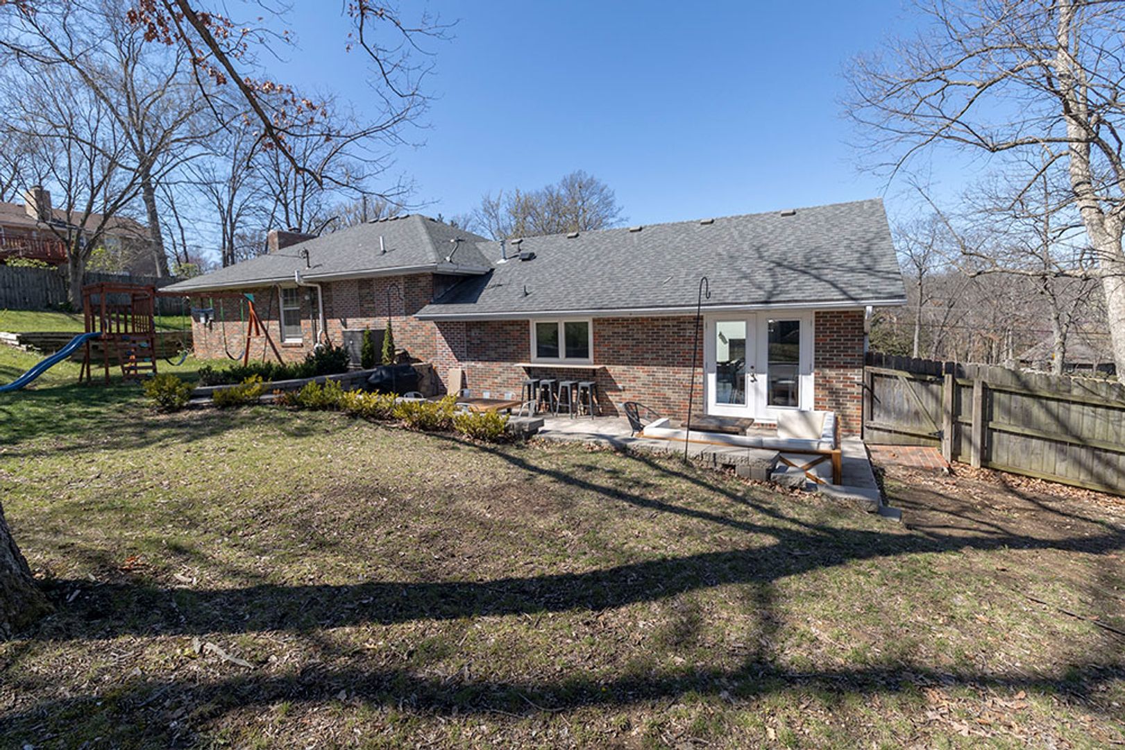 Downstairs, the lower level family room beckons with its cozy fireplace and adjacent full bar area, perfect for entertaining or cozy nights in. Step outside to discover the expansive fenced backyard, complete with a large patio—an inviting space for al fresco dining or simply enjoying the outdoors.